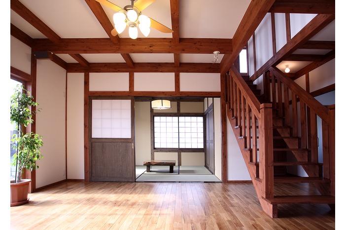 オープン階段がリビングから和室までの広がりある空間に